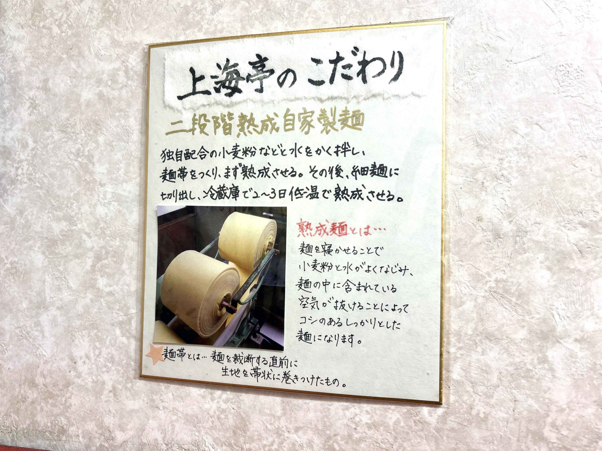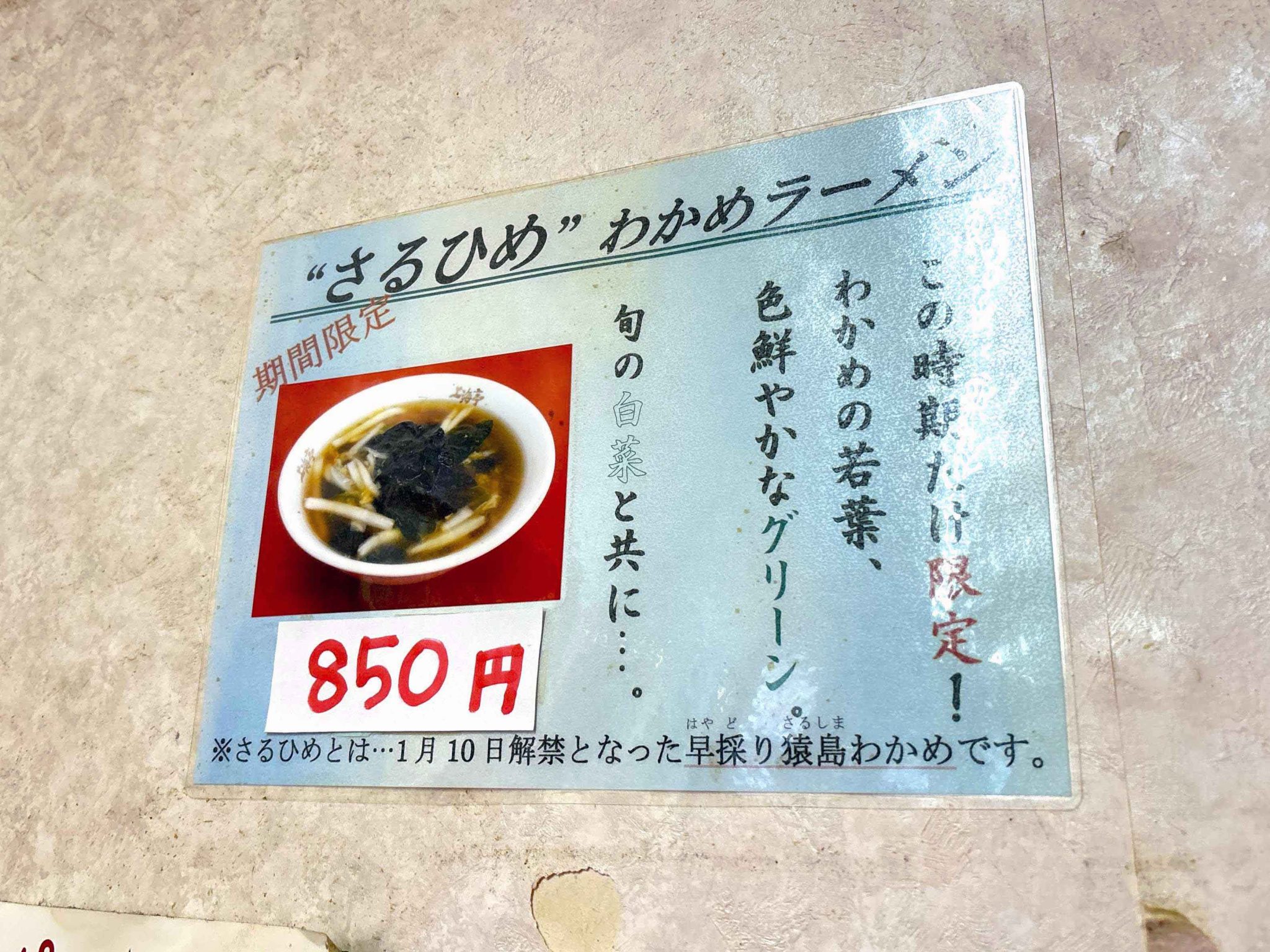 店内に「さるひめわかめラーメン」と、自家製麺の説明の案内