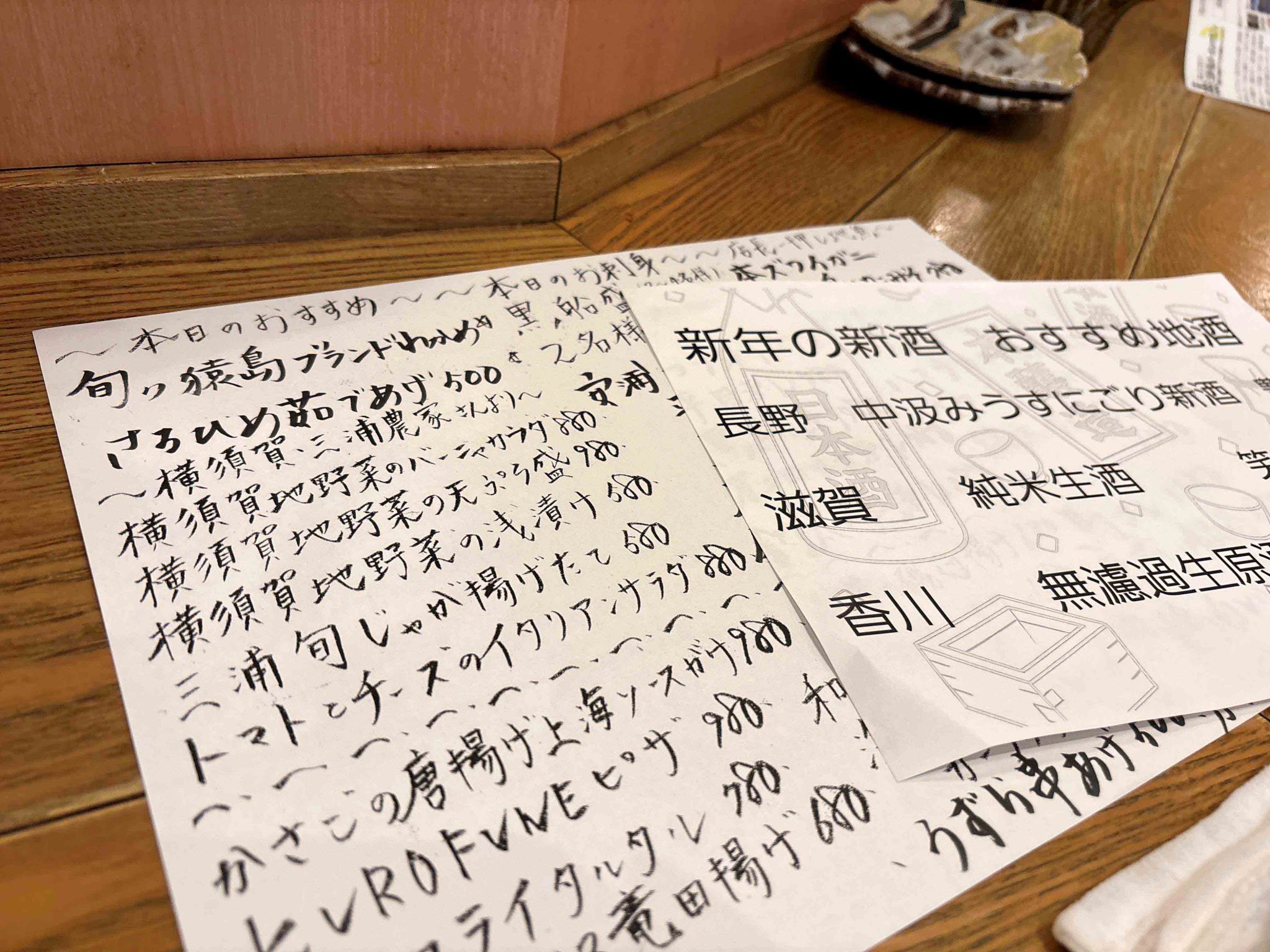 せっかくですので、新年の新酒の中から、さらっとした滋賀の純米生酒「笑四季」と「横須賀自野菜の浅漬け」をお供にしました。どちらもさるひめの味を邪魔しないやさしい味でした。